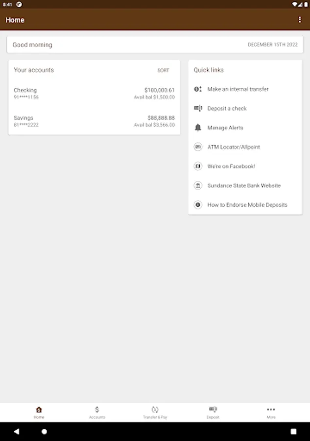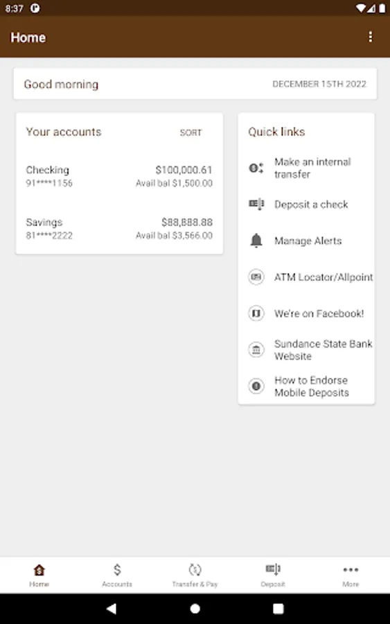 Manage your finances with Sundance State Bank mobile banking. View checking account balances and savings account balances. View recent activity. Transfer funds between eligible Sundance State Bank accounts.
