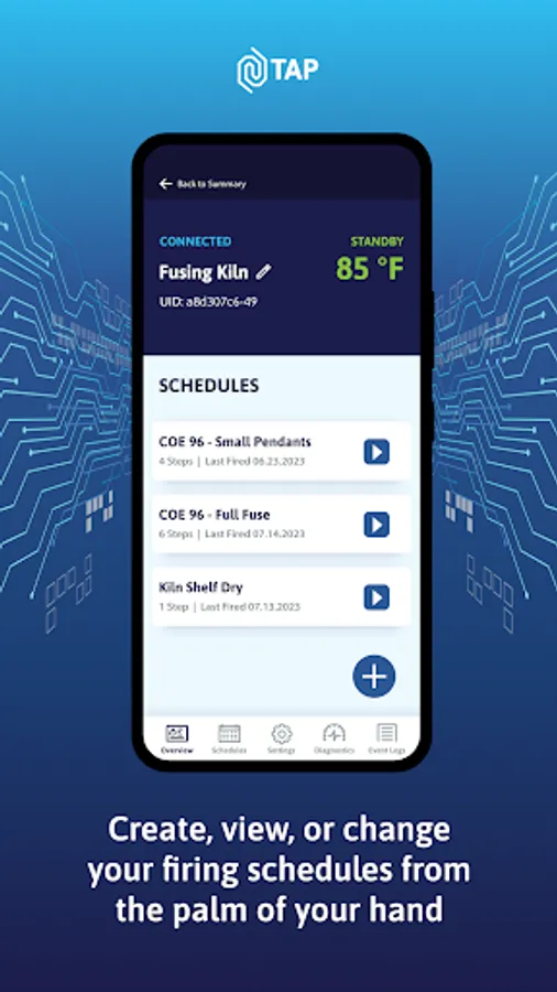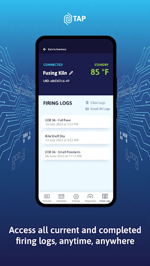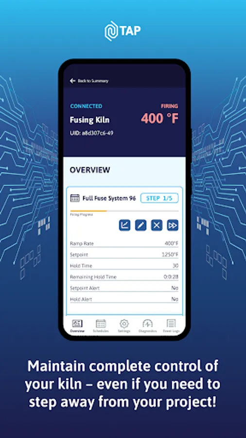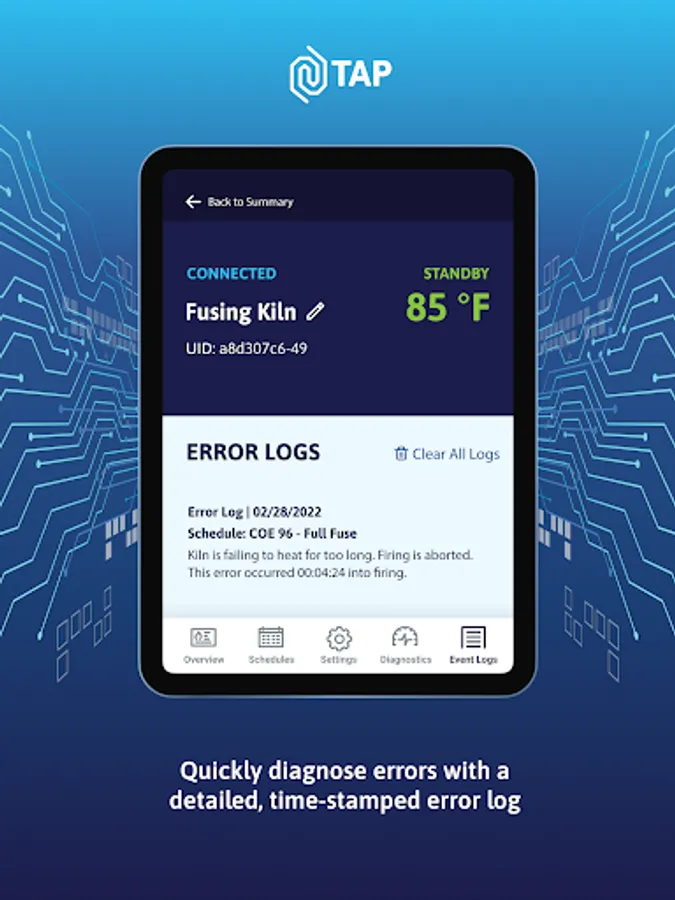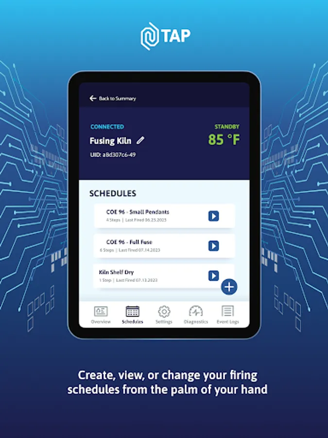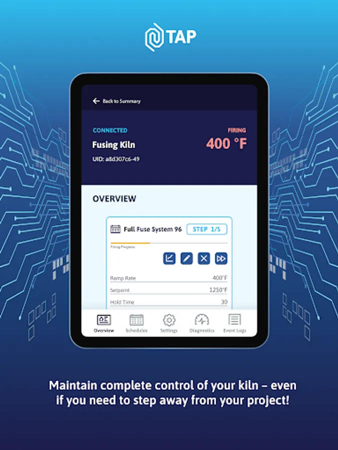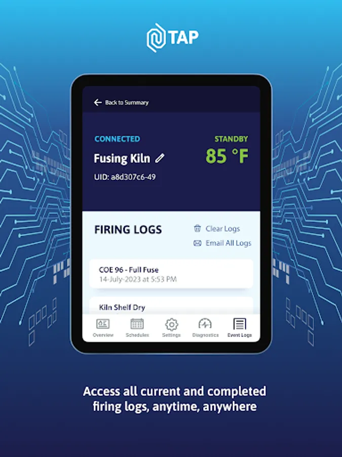 Maintaining complete control over your kiln is crucial, however, what happens when you need to step away from it for a long period of time? Should something go wrong, precious time, energy, and resources are wasted. With the TAP Kiln Control Mobile App, you can continue to remotely monitor, update, and maintain control of your kiln as though you never left.