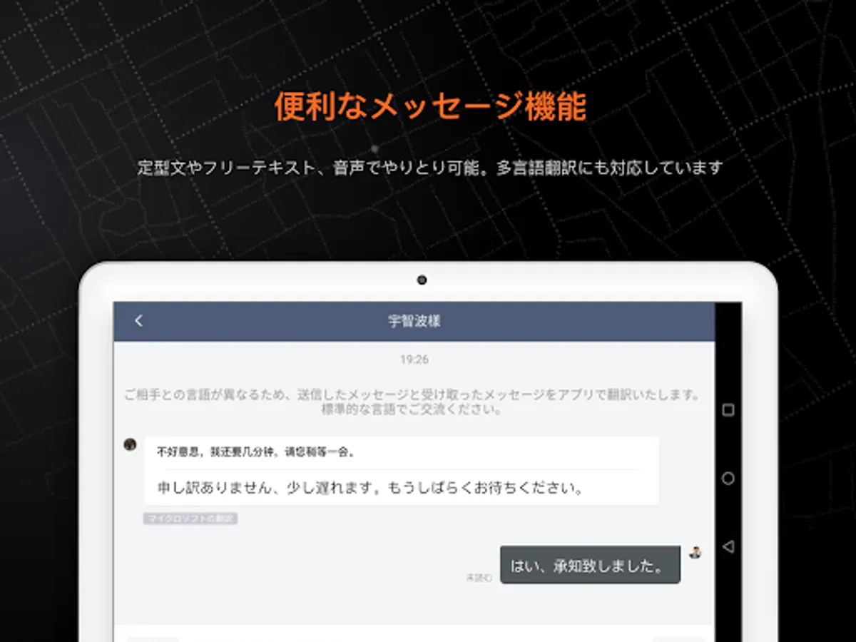 You can send a message on the app and contact the boarding point. The driver's and passenger's phone numbers are also not unique to each other. With the automatic message translation function, you can communicate smoothly with foreign passengers. (Japanese/Chinese available)