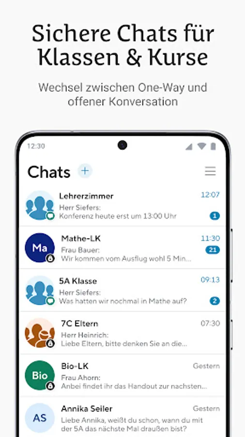 - For teachers: With the OSS Messenger you can reach everyone involved in the education process in compliance with GDPR. Protect your privacy: The OSS Messenger works without a cell phone number, i.e. you alone control your chat functions by switching between one-way (only you can write) and open conversation (everyone can write). You can also request read receipts for your messages with a click, in order to have an overview of the status of your sent messages at any time. You can set individual availability times for the whole day or for certain days or times.