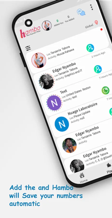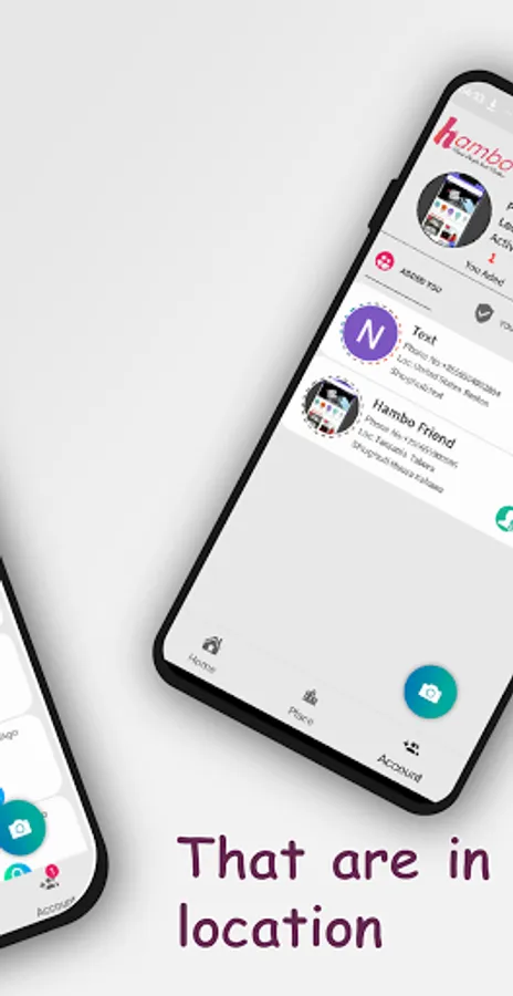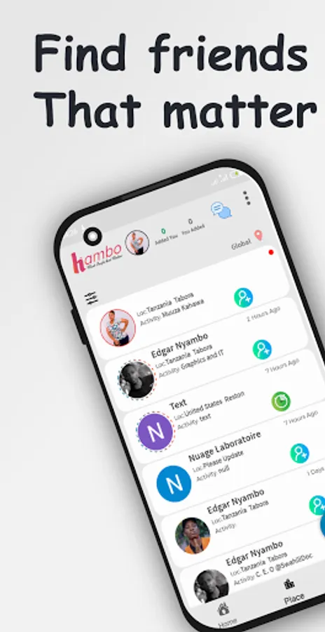 Hambo is the app that takes you around your place to create new friendships. You can chat add them or post status; Hambo save your numbers on youre phonebook automatic after accepting youre friend request. Make friends by visiting places , share your place by creating your own. Talk to people from every corner of your place eg youre carrent city, find friends and explore the place you are in your own way. Share worlds, share friendships.