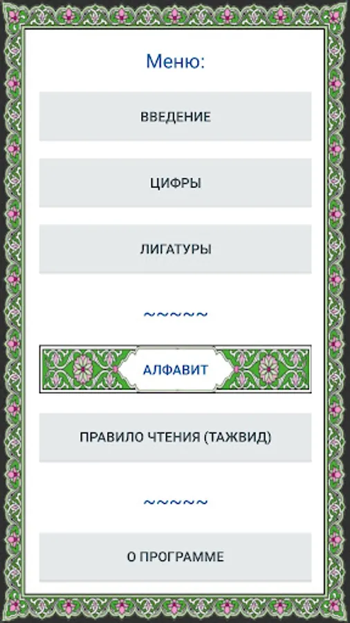 This program was created for additional study of the rules of reading the Quran. An uncomplicated interface in Russian and the presence of interactive functions will help the user to learn the rules of reading, the alphabet and the pronunciation of letters.