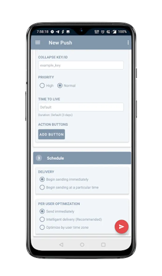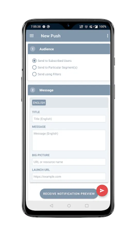 This app has lot of customization features of notification like including segments, exclude segments, send using filters, send to particular platform, see notification preview, add image, add additional data, action buttons, lots of platform settings, see notification history, check stats of sent notification, and you can also schedule your notification.