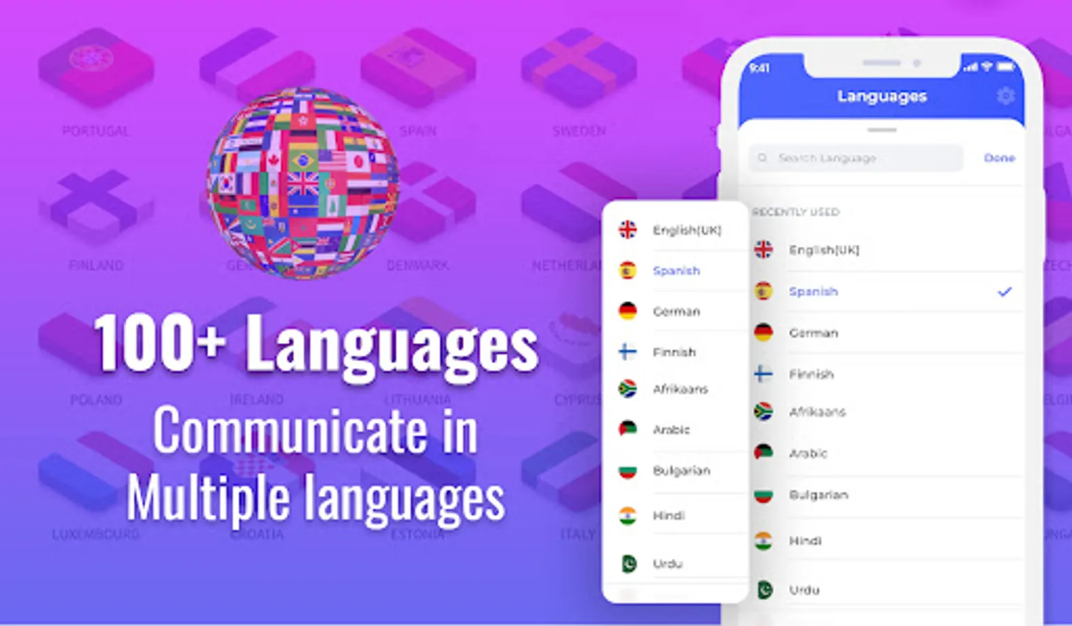 Audio translator guru text supports Spanish language, Translate English to Spanish, English to Hindi, English to French, Chinese to English, Arabic to Swedish, interpretation from Dutch to Chinese Simplified Using all language translator app speak and translate.