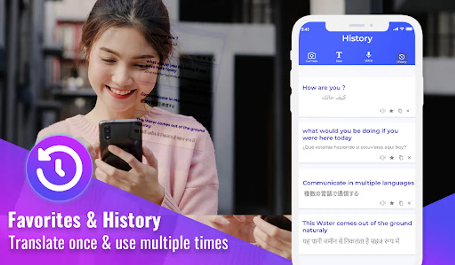 -Global language translator app saves your translation in the history you favorite your text and you see this history when you want