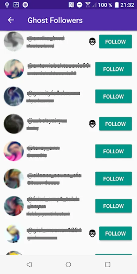 ✓ all your ghost followers (fans) and allows you follow them directly from our app!