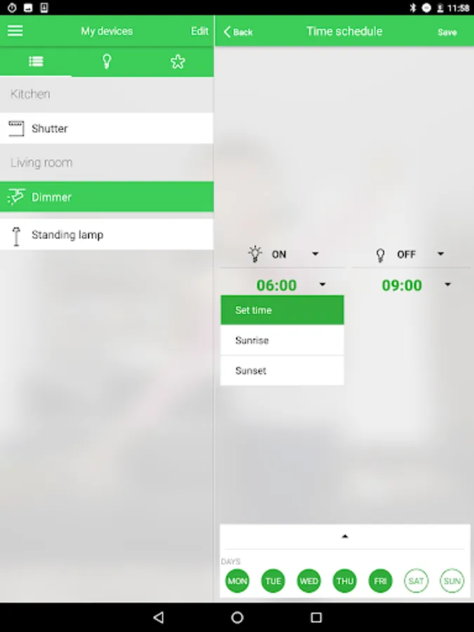 Wiser Room for Bluetooth enabled switches with time control. With this App device functions can easily be set and programmed by simply connecting your smart phone or tablet. Via Bluetooth the settings will be transferred to the Wiser Application module. This way light can be turned on, off and dimmed, shutter can be rolled up and down and time controlled actions can be programmed including sunrise and sunset functionality. A simple and convenient way to add comfort to your daily life.