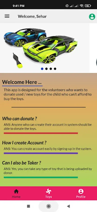 This application is user friendly, anyone can voluntarily use this application in order to donate or to take toys. Our motive is just to spread joy amoung children so that every child can play with toys and ejoy. It's absolutely free for all.