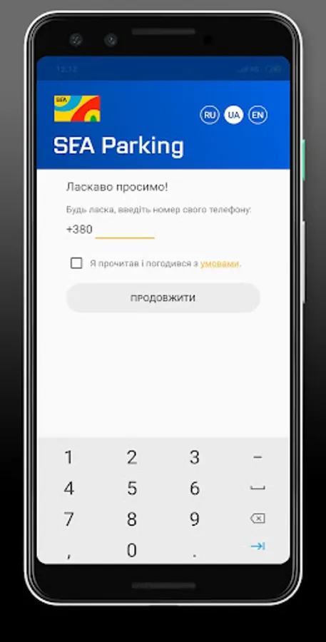 To use the SEA Parking add-on after downloading and installing on a mobile device, the user is identified by a mobile phone number, registration is confirmed by code from SMS and agreed with the terms of use of the program.