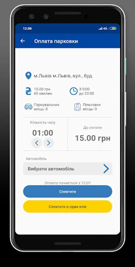 Payment screen allows you to set the parking time - and immediately receive the cost for the service (calculated automatically according to the tariff), - choose a vehicle and make a payment.