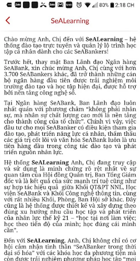 SeALearning system, you are accessing and using is the most clear evidence of the interest of the Board of Directors, the Board of Management and the result of intellectual strength as well as effective cooperation between the Block Human Resource Management Department, SeABank Academy and Information Technology Division, along with many other Divisions, Divisions, and Departments. This is also a system designed and built in accordance with the trend of 21st century century learning and development needs - "learning at work; learn according to your progress; learn exactly what you need ”.