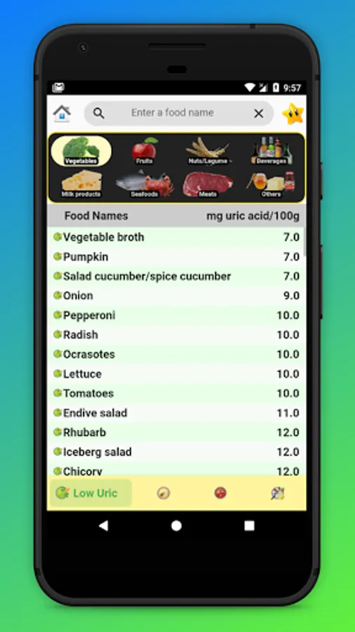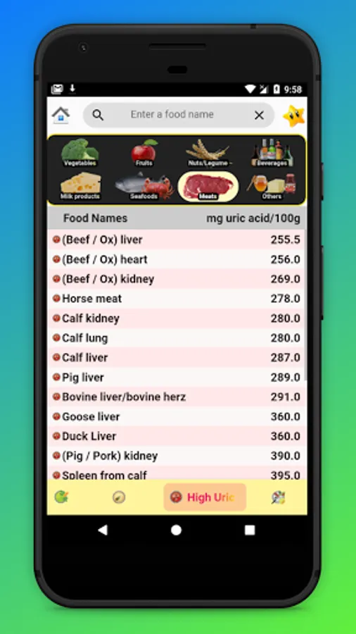 Show list of foods with acid uric content, gout diet: more than 700 foods.