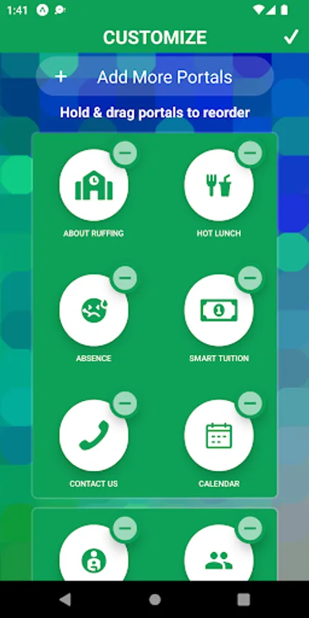 Your Ruffing Montessori app is fully customizable by you: Rearrange your portals to easily access whichever features you use most. If you want to check school events frequently, you can put that portal front and center. If you never check school social media, you can turn that portal off.