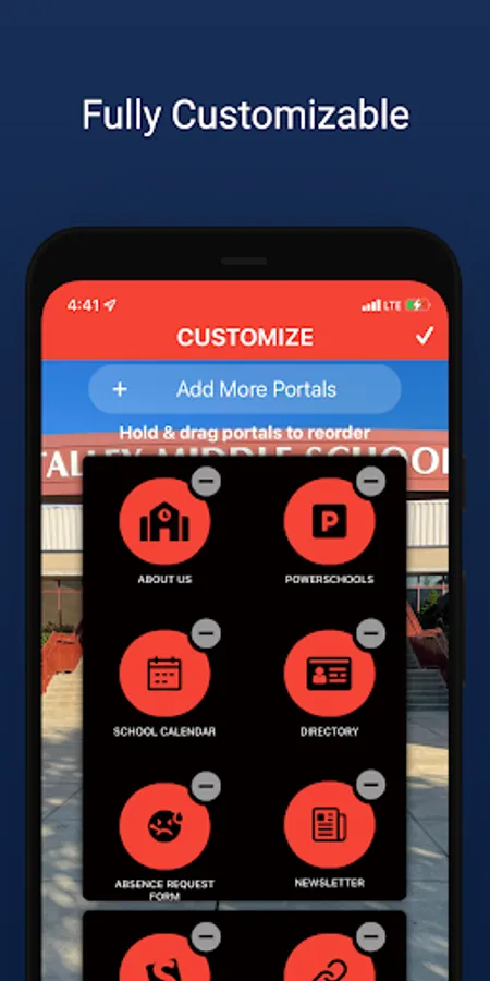 Your Talley app is fully customizable by you: Rearrange your portals to easily access whichever features you use most. If you want to check school events frequently, you can put that portal front and center. If you never check school social media, you can turn that portal off.