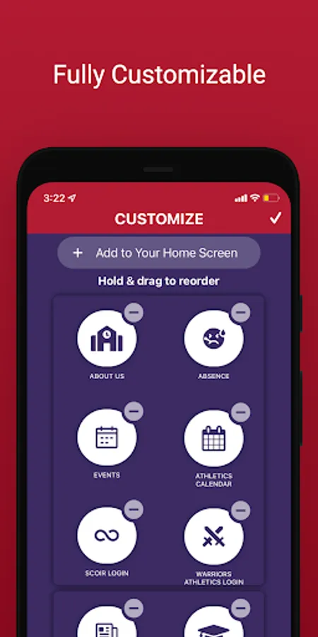 Your WCS app is fully customizable by you: Rearrange your portals to easily access whichever features you use most. If you want to check school events frequently, you can put that portal front and center. If you never check school social media, you can turn that portal off.