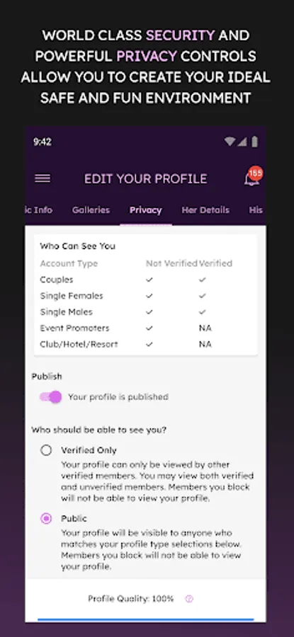 Your safety and privacy are our top priorities. Quiver puts you in complete control of your profile and interactions. Decide when you’re visible, who can see you, and who can connect with you. Use custom photo galleries to share private content with members of your choice—you’re in charge, always.