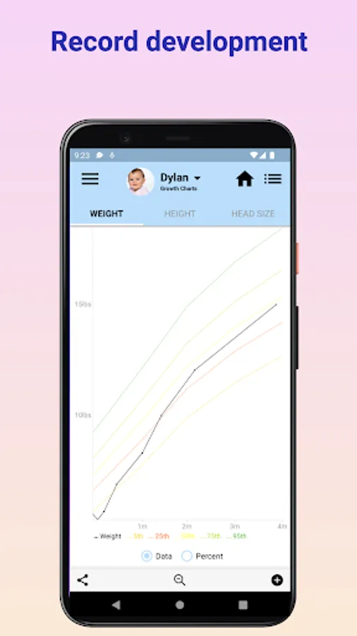 Attach baby pictures and view your baby’s development milestones and growth charts. Track baby weight, height, blood type, allergies, and head size while comparing it with the US or international percentiles.