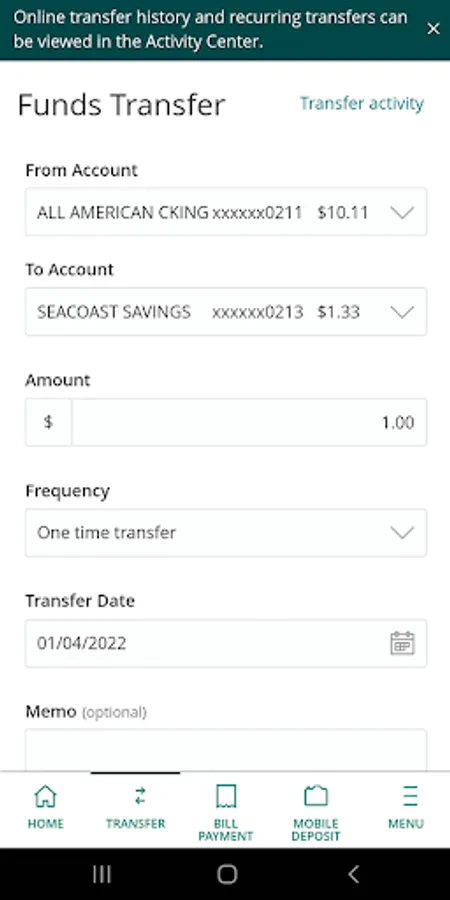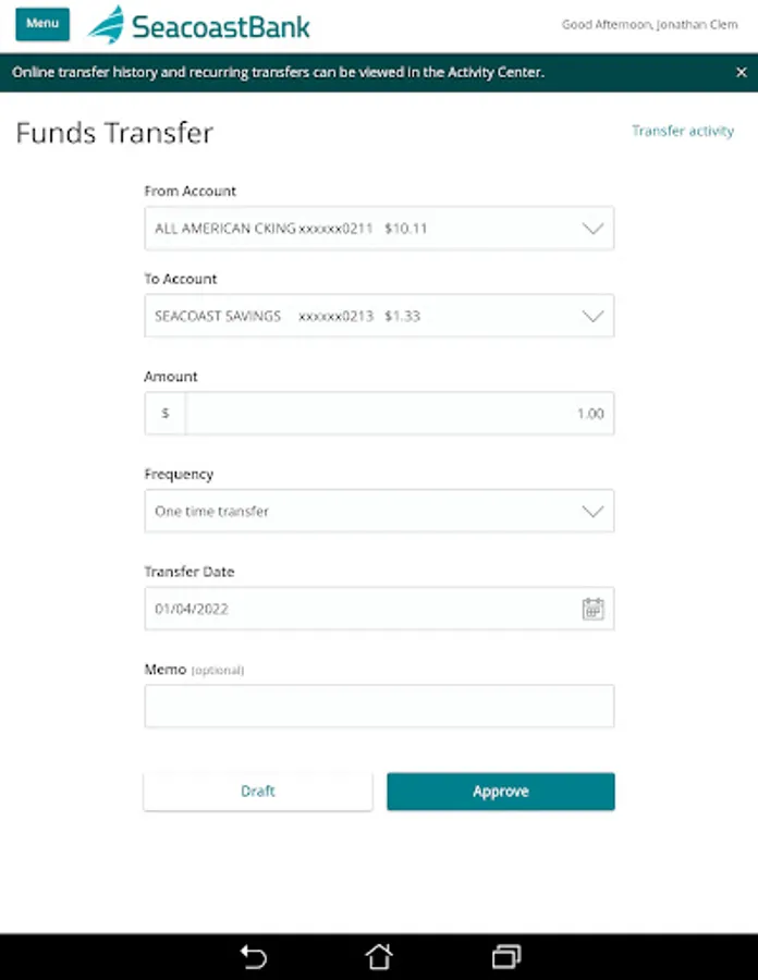 ⁻ Transfer funds to other accounts owned by you or to another Seacoast customer