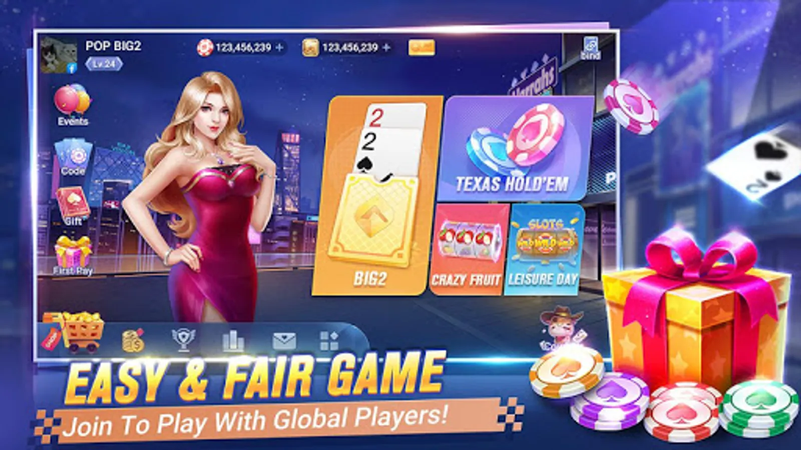 In POP Big2, there are Big2 / Capsa Banting, Texas Poker, Slot and various fun games for you to try. Easy to play, simple and fair. Play and show off your skill!!