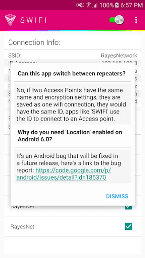 It's an Android bug that will be fixed in a future release, but in the meantime, you have to enable Location for SWIFI to work. I know this is annoying, sorry :| https://code.google.com/p/android/issues/detail?id=185370