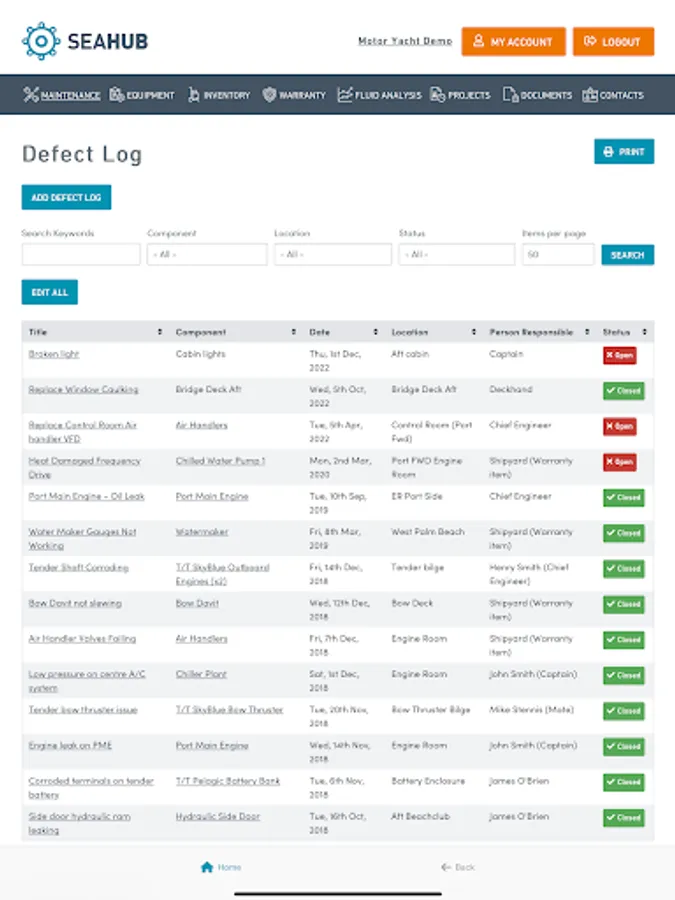 - Equipment database (Make / Model / Serial Numbers of components onboard)