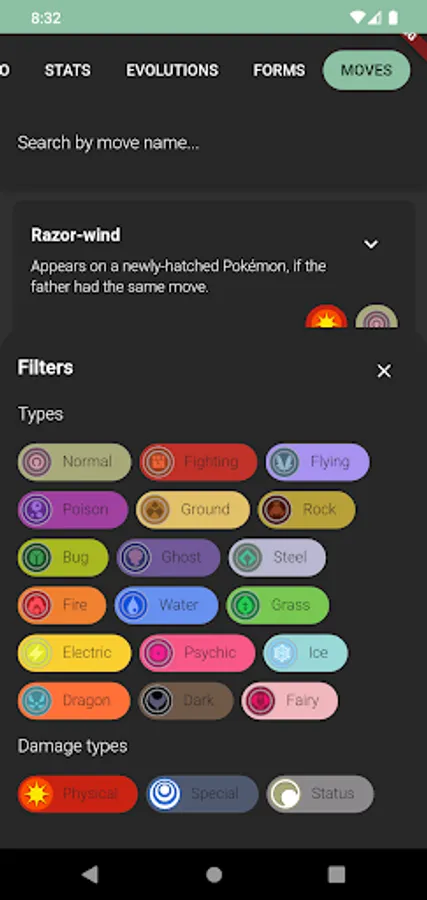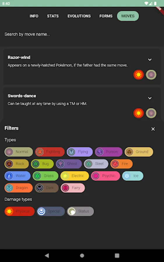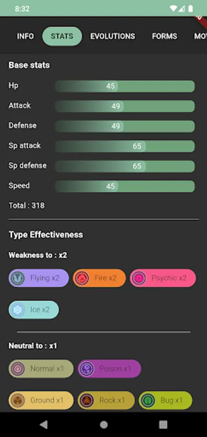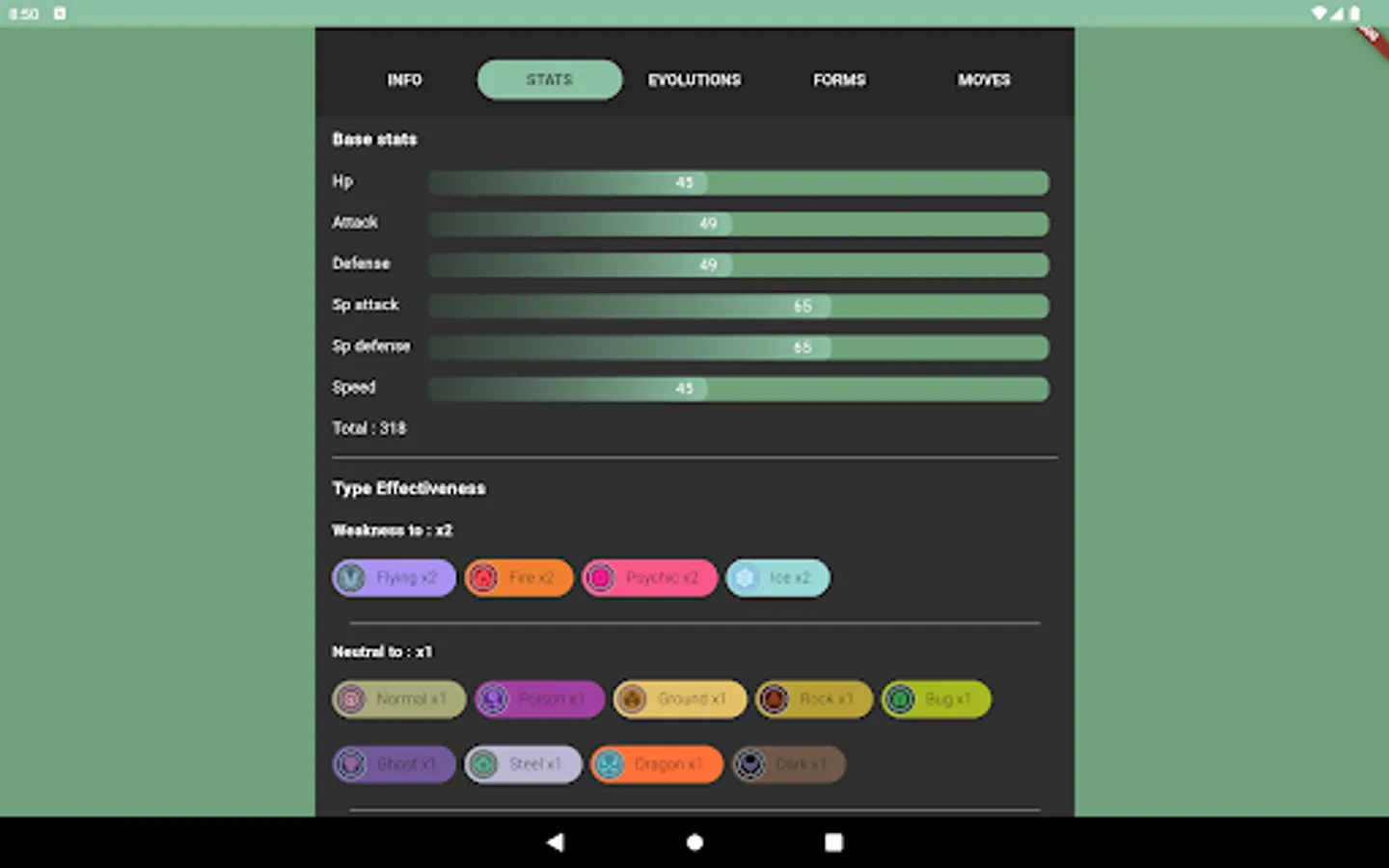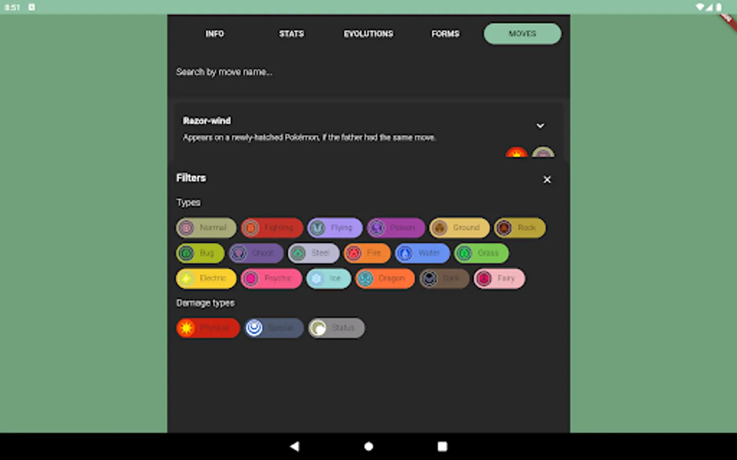 Allows users to search and filter pocket monsters, selecting one presents info, encounters, weakness and resistance, base stats, evolutions, forms and moves.
