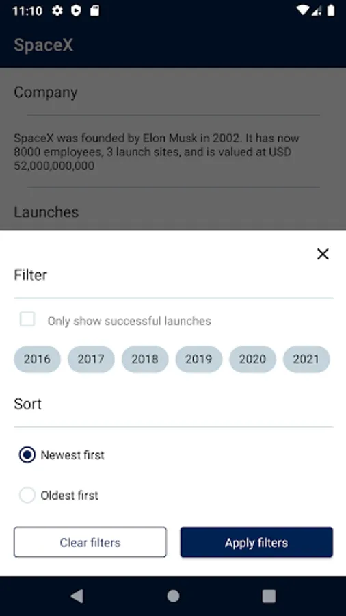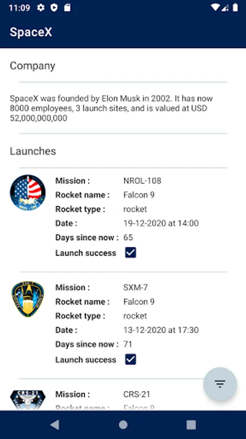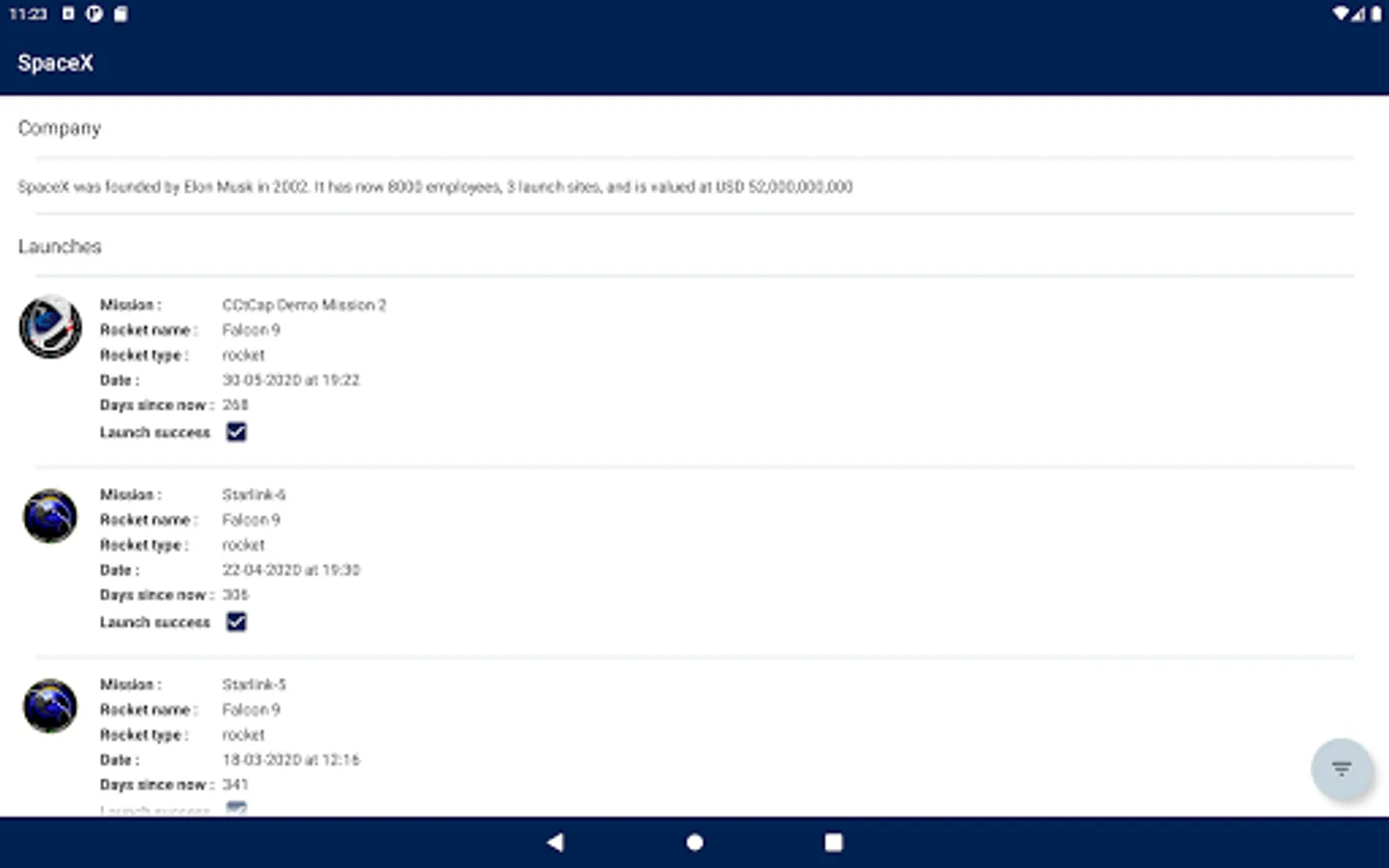 Not affiliated with Space X in any way shape or form, this is a Space X client that consumes the Space X API it is a project you can find on github to showcase good android architecture to perspective employers,
