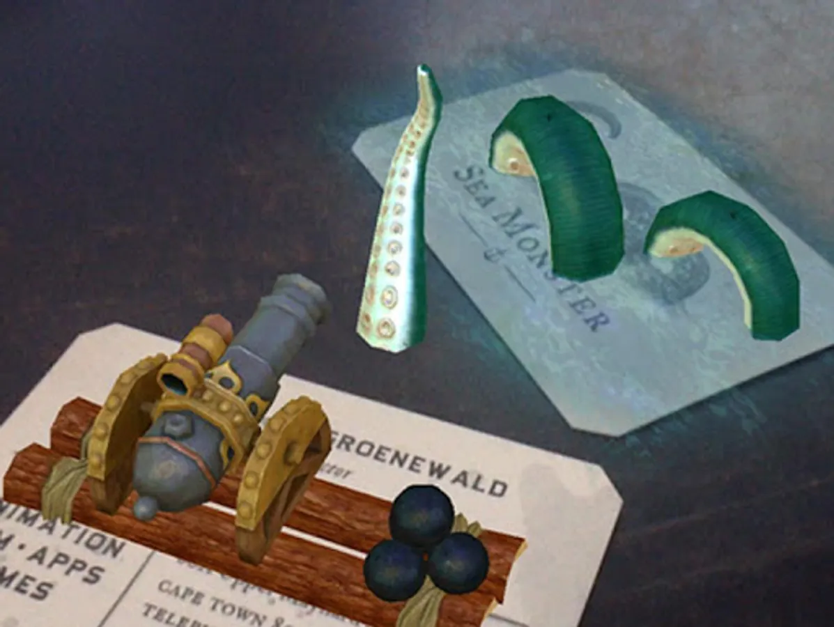 Choose the toy mode on the left and point the device at the Sea Monster business cards to see a 3D cannon and monster appear in Augmented Reality and begin trying to destroy each other.