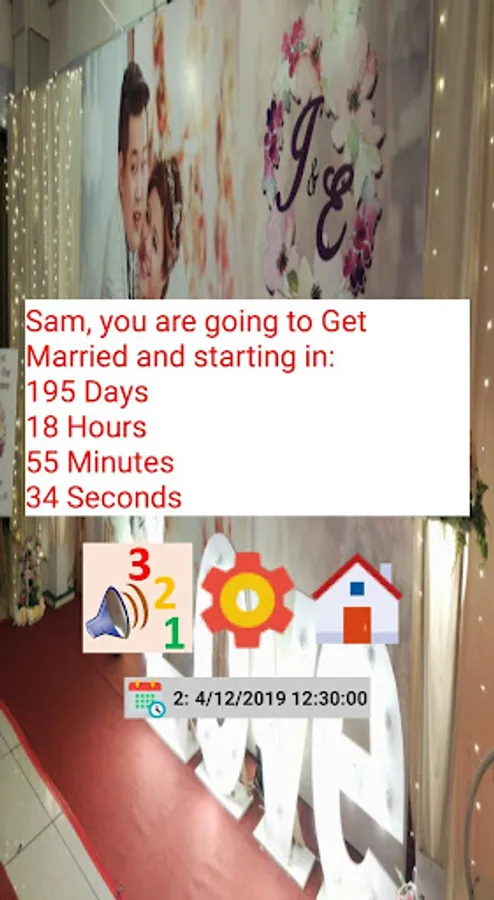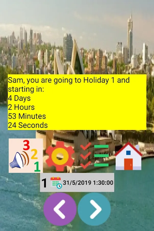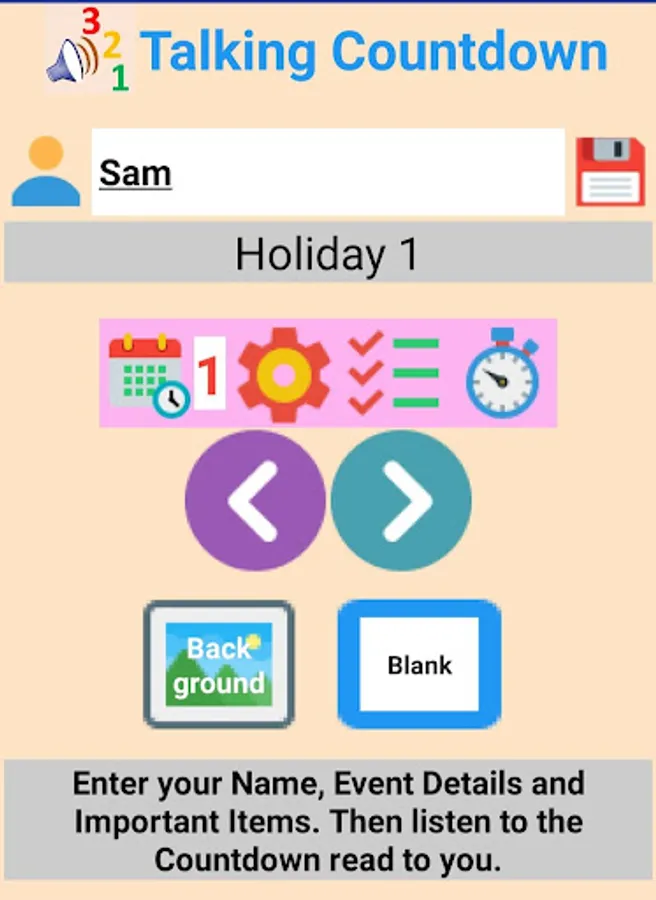 See and hear your mobile call up your name and countdown the days, hours, minutes and seconds for you. You can customize the events descriptions and they will be read to you.