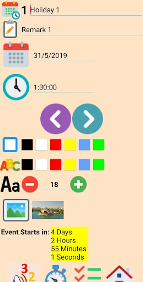 There are few sample Countdown background pictures to use. Furthermore, you can change the Countdown background pictures, using pictures from your mobile device. Do change the font and text background colors to suit your mood.