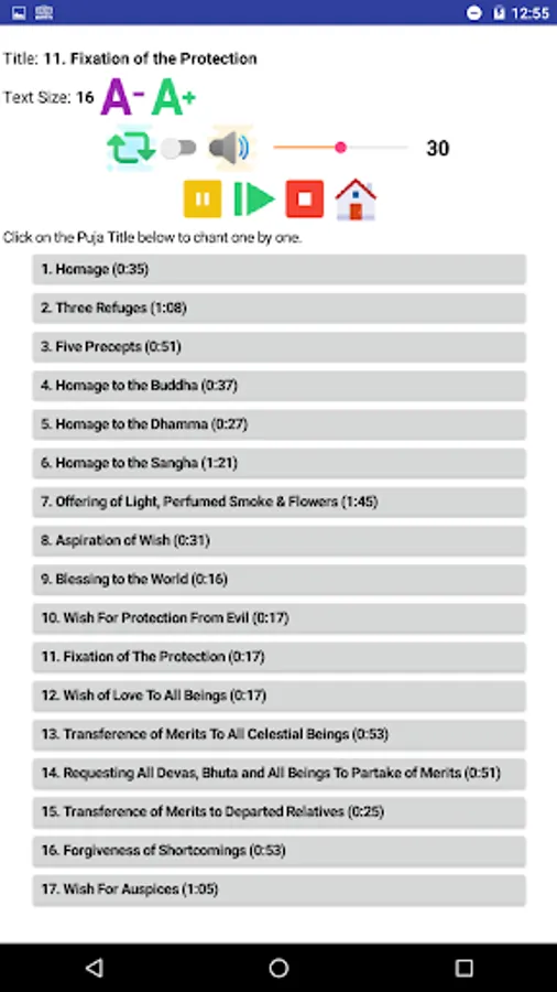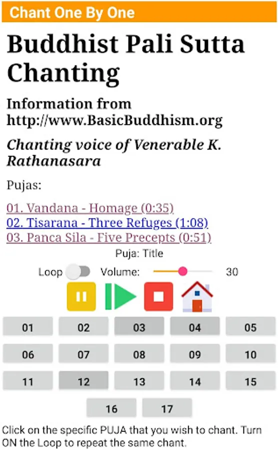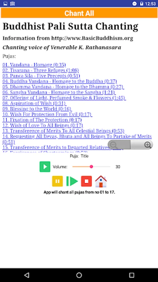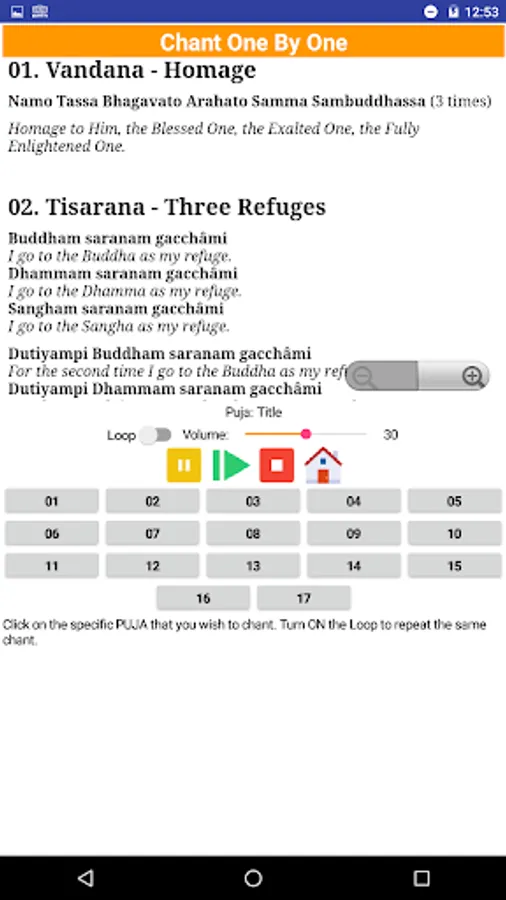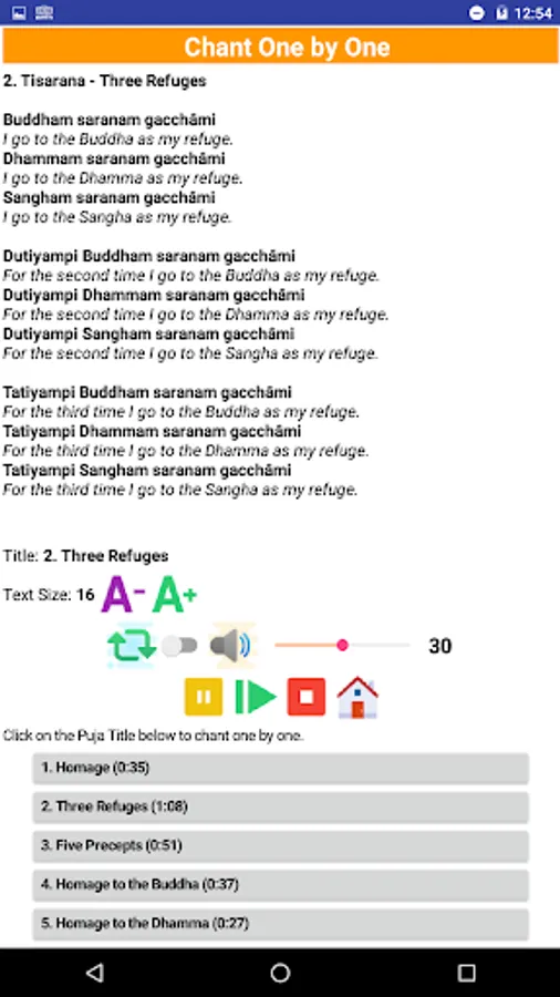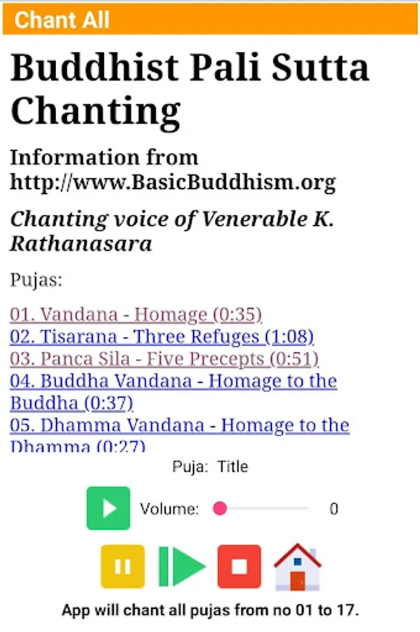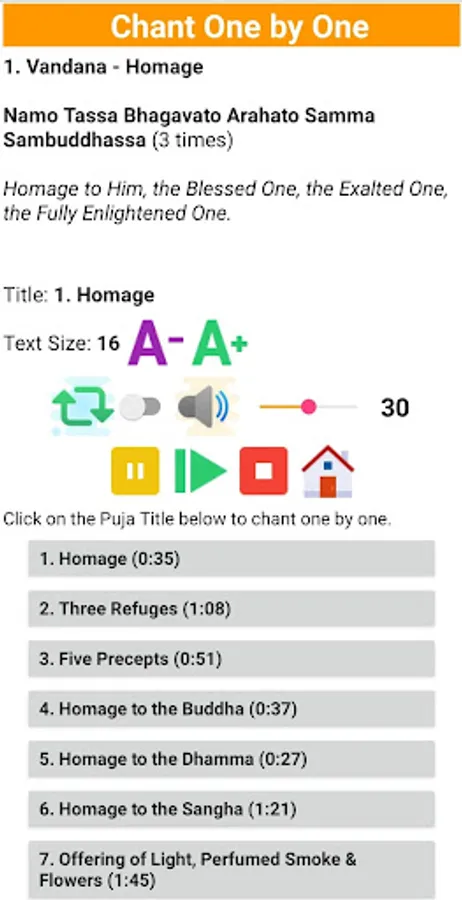 Listen the chants with a monk's voice. Follow the chants in Pali text and read the English translation for each verse.