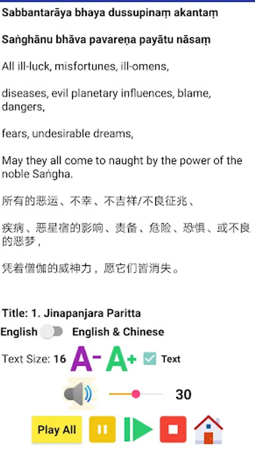 Listen the chants with a monk's voice. Follow the chants in Pali text and read the English and Chinese translation for each verse.