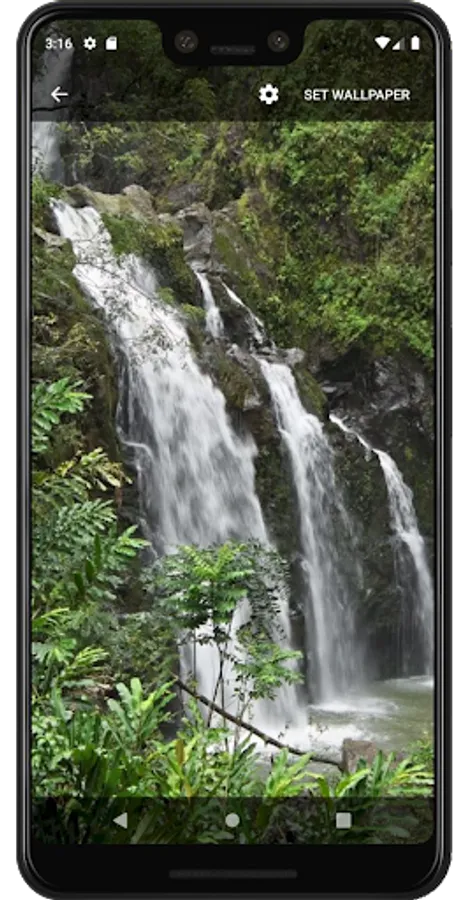 This app is a high-resolution live wallpaper of a multi-tiered waterfall, appears after a quick rain storm, flowing into a small crystal clear blue pond, inside of a dense rain-forest at side of the Road to Hana Highway, Maui, Hawaii, USA. It's made of a high quality HD video. The app runs smoothly and efficiently, and it consumes very minimum battery power, memory and cpu time.