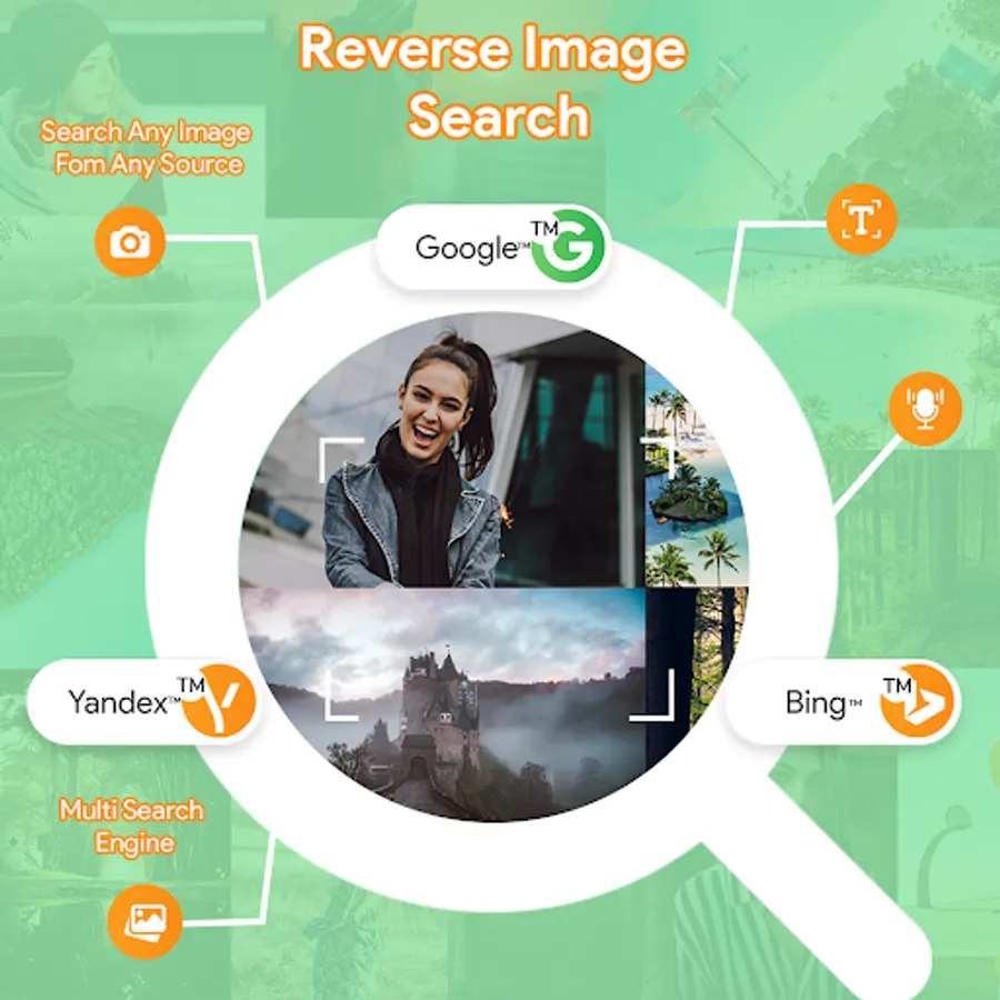 A sophisticated reverse image search tool support voice to perform a reverse search by image lens through several photo search engines, including Google™, Bing™, Yandex™, and More