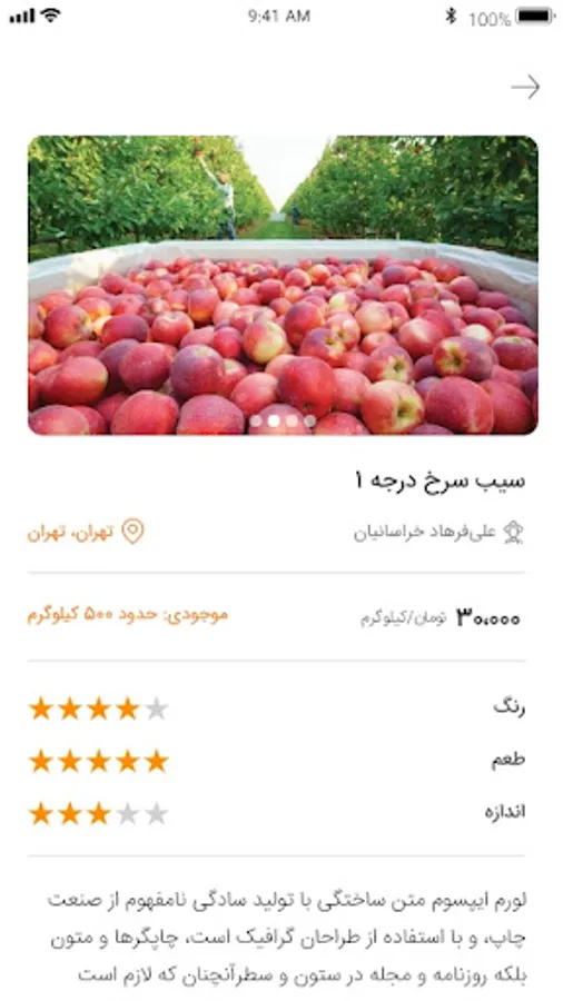معرفي مناسب محصول به تمام بازارهاي كشور و حتي بين المللي،مشاهده و بررسي قيمت انواع محصولات،امكان مشاهده محل بار اسالي با استفاده ازGPS,مشاهده رتبه محصول و كشاورز،...تنها بخشي از امكانات فراهم شده در اين بستر الكترونيك ميباشد.اميد داريم كه كيفيت خدمات و سهولت استفاده از اين اپليكيشن عاملي جهت دستيابي به مزيت هاي مد نظر براي تمام كاربران اپليكيشن قرار گيرد.
