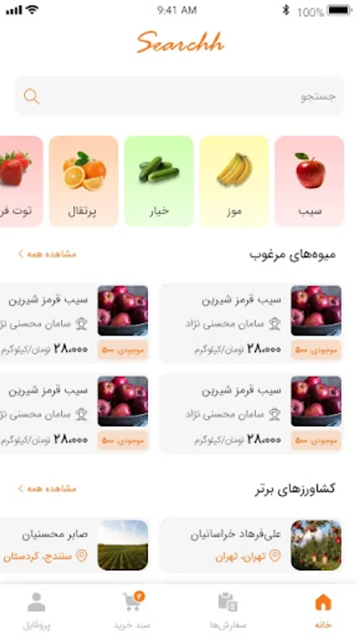 طراحان اپليكيش سرچ (searchh)به عنوان عضوي كوچك از جامعه كشاورزان و باغداران ايران با توجه به آشنايي مشكلات اين قشر از قبيل عدم امكان معرفي مناسب و فروش عادلانه محصول كه متاسفانه باعث بروز زيان چند جانبه براي كشاورزان ،خريداران و نهايتا مصرف كنندگان نهايي ميشود،در تلاش هستند تا با ايجاد يك فضاي مشاركتي در قالب اپليكيشن موبايلي(Ios,Android) اين امكان را براي فروشندگان ،خريداران و نيز رانندگان ناوگان حمل و نقل جاده اي فراهم آورند تا تنها با انجام چند كليك از فرصتها و مزايايي بينظير بهره مند گردند.