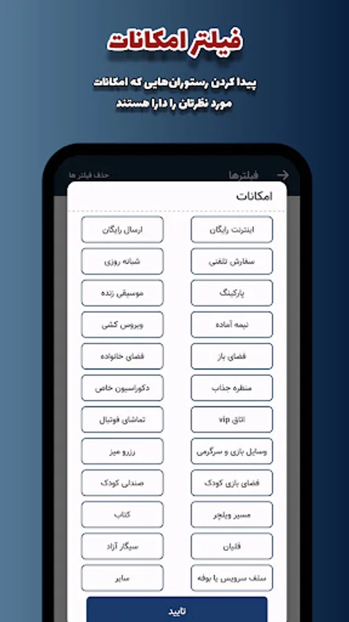 ✅ In the facilities filter, you select the facilities that you would like a cafe or restaurant to have, for example, open space, parking, live music, anti-virus items, etc., and a search will show you the food collections that have these facilities.