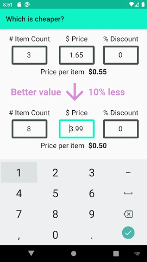With this grocery calculator, you can easily compare these two prices. With just a couple of taps, see which is the grocery deal. (In this case, get the 7 bananas for $0.80). See which is cheaper!
