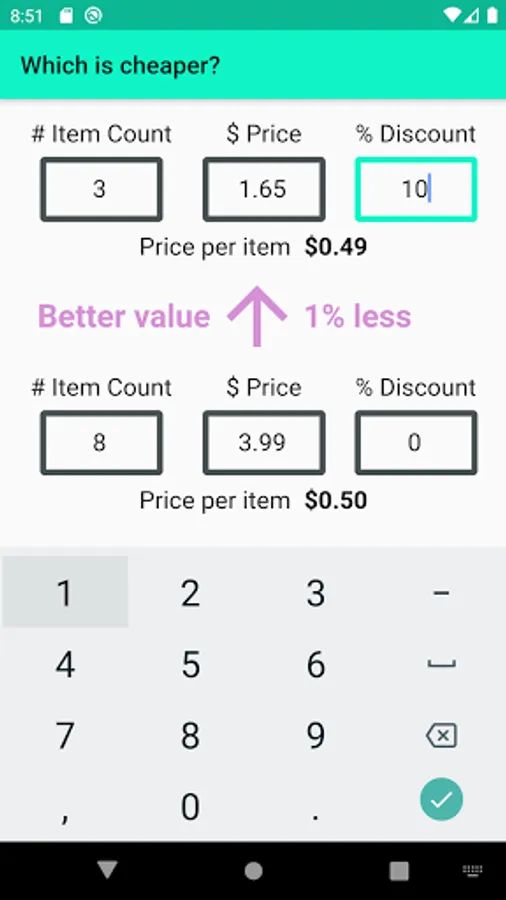 Stores often sell items in different sizes. Using this grocery calculator app, you can do a quick grocery price comparison, and see which size is the cheapest, and which deal is the best value.