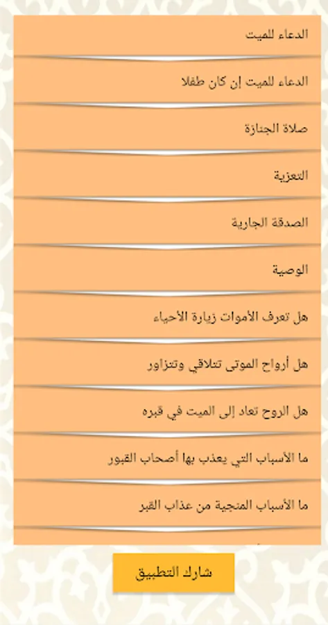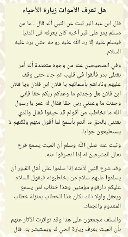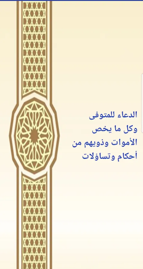 في هذا التطبيق يتطرق الكاتب إلى كل ما يتعلق بالأموات وذويهم من أحكام وتساؤلات. فمن الدعاء للميت إلى إجراءات بعد ما الموت، إلى زيارة الميت وهل يعرف بمن زاره، إلى نعيم القبر وعذابه، إلى ما ينتفع الميت به من الأعمال والصدقات الجارية...