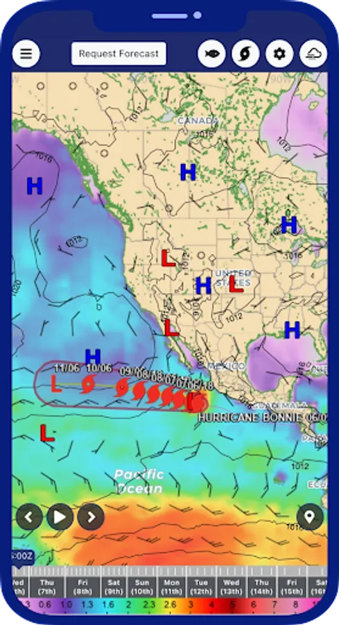 Weather data and forecasts are continuously received and processed in house and immediately distributed to the website and mobile application. You have complete control over the map at the tip of your finger. You can pan the map all over the world and zoom in and out. The forecast maps provide graphical forecasts going out 2 days for Basic subscribers, and 10 days for Premium subscribers. The Angler’s Basic and Premium subscribers will have additional access to the Fishing Planner. Visit www.seaweather.net for more information about subscriptions.