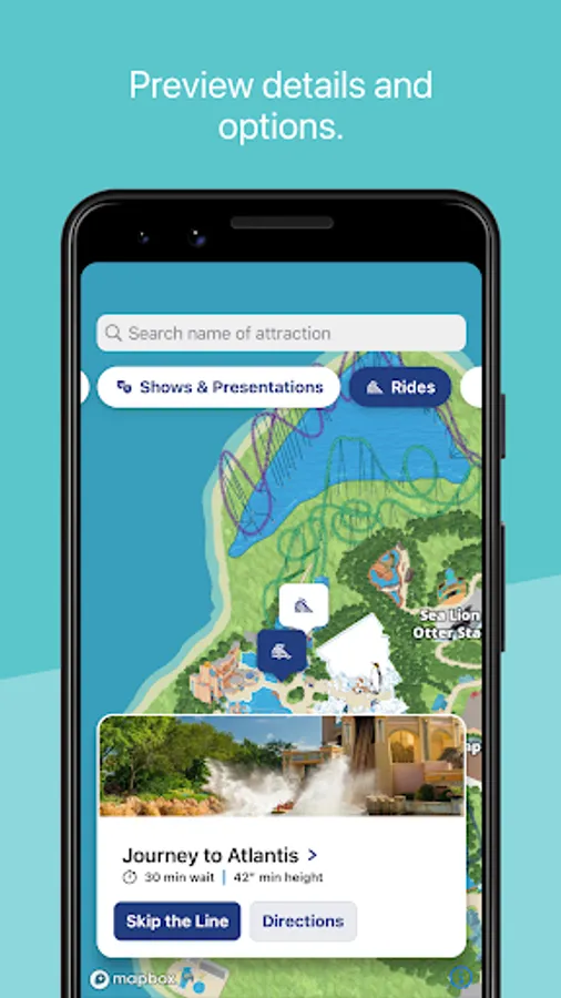 • View ride wait times and upcoming showtimes so you can plan your next move
