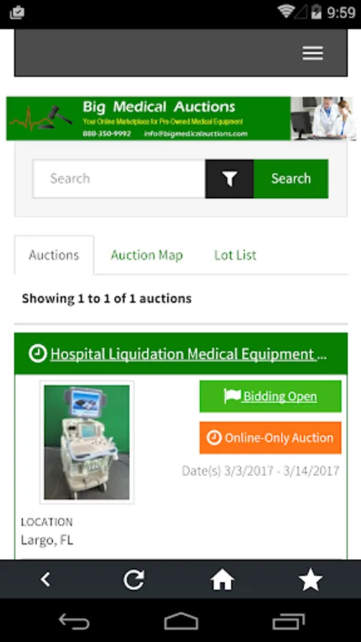 Access our Global Online Auction of Hospital & Doctor Medical Equipment on your mobile device. Ultrasounds, Imaging, Anesthesia, Endoscopy, Dental, Surgical Tables, Surgical Instruments, Therapy, Exam Room, AED, Stretchers, Patient Monitoring and Lab are all Auctioned to the Highest Bidder each month.