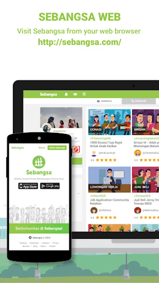 Bergabunglah bersama komunitas Anda di Sebangsa, untuk mewujudkan ekosistem komunitas di Indonesia yang dapat memperkaya pengalaman ke-Indonesiaan dengan kearifan lokal yang sarat akan kreativitas, toleransi, dan kebersamaan yang bermanfaat bagi orang banyak.