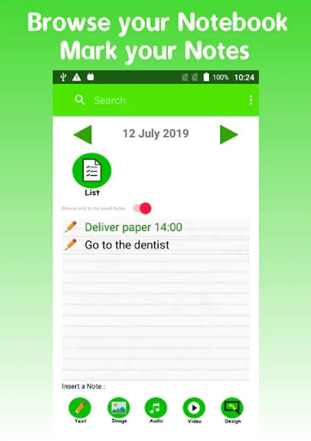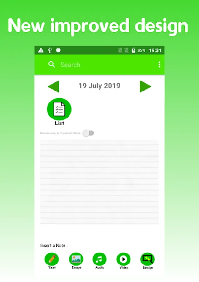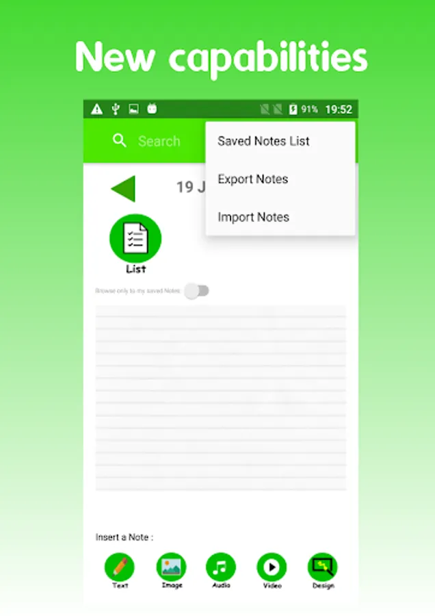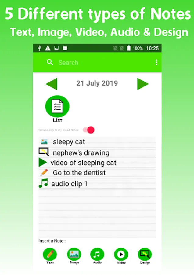 - Save your notes in 5 different types : text, image, audio, video or even design it yourself