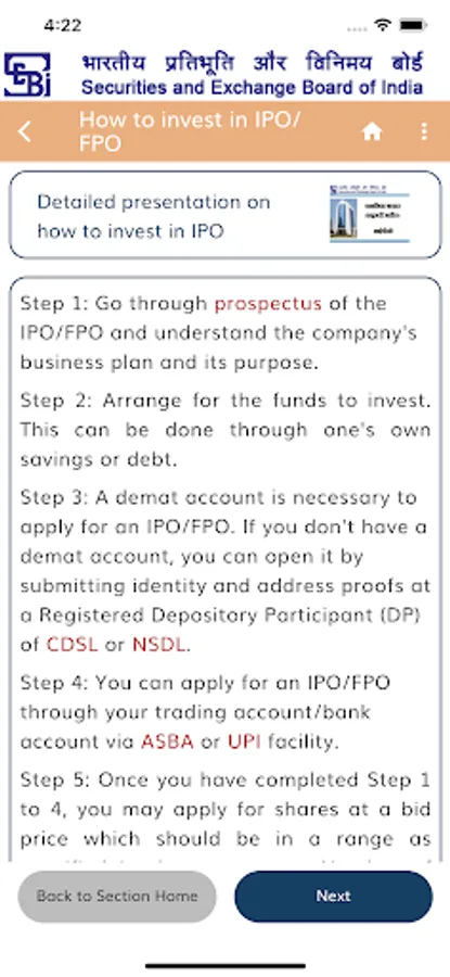 The SEBI Investor Awareness application is developed and maintained by Securities Exchange and Board of India (SEBI) to create awareness about the securities market among existing and prospective investors.
