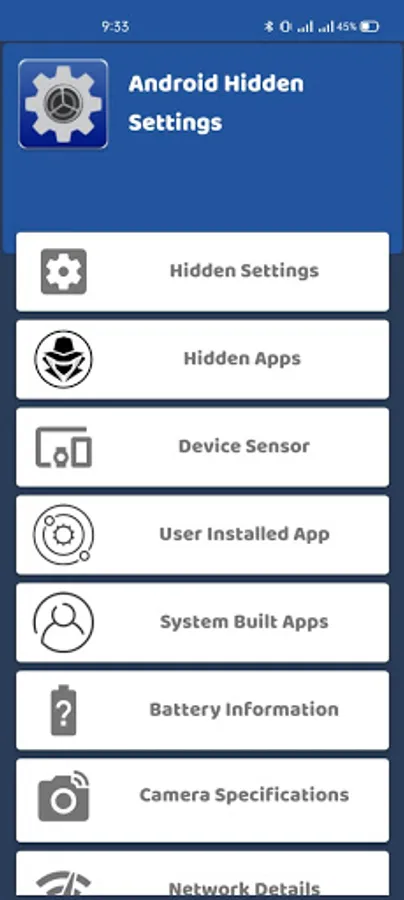 Hidden settings application has more more other function like finding hidden apps in your smartphone, we added a function feature that will find all hidden apps in your smartphone then you can perform any action with our hidden android setting app. with options of hidden apps detection we also provide all sensor information like magnetic sensor, light sensor, smart detection sensor etc. so take advantage of our free application and install it now.