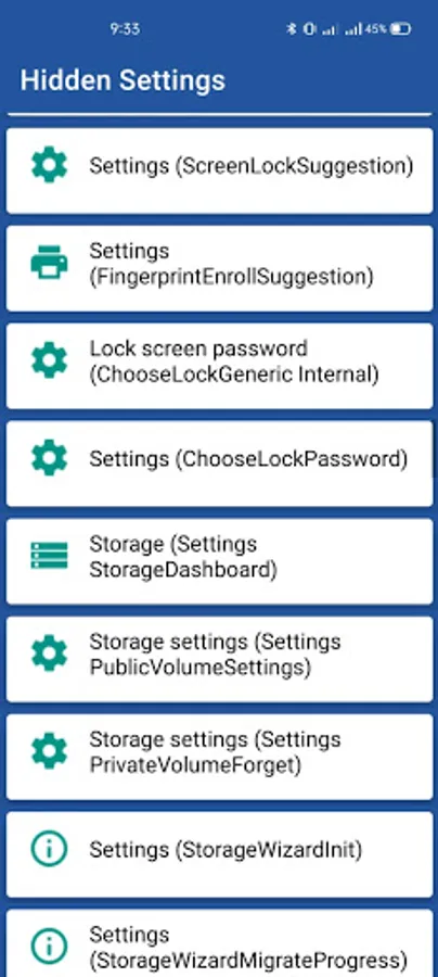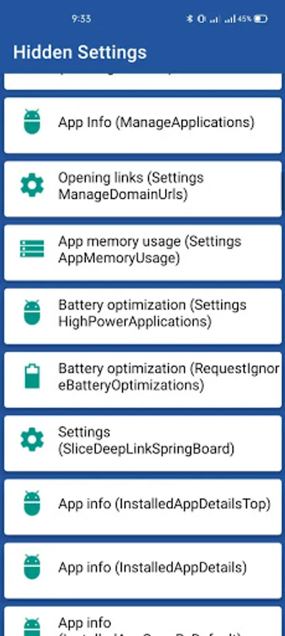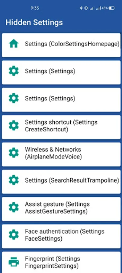 Android hidden settings app is a one stop solution to explore all your phone's hidden settings and to know your phone info. Android hidden settings gives users the access to shortcuts and some hidden features in your phone. Hidden apps settings or android hidden settings this app allows you to open certain android settings, which some phone vendors hide from the user. Hidden Settings for MIUI. This app shows you only the available options for your device. App uses knowledge about android system that is not documented, so not all settings will work on your phone.