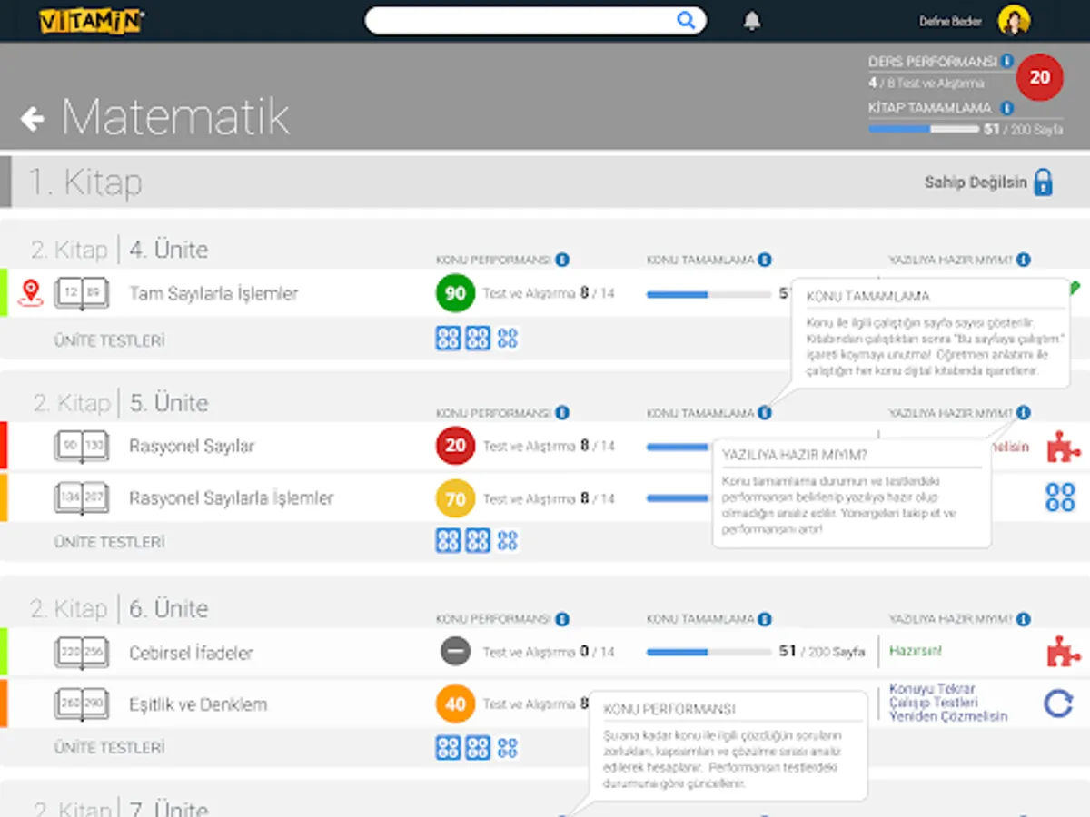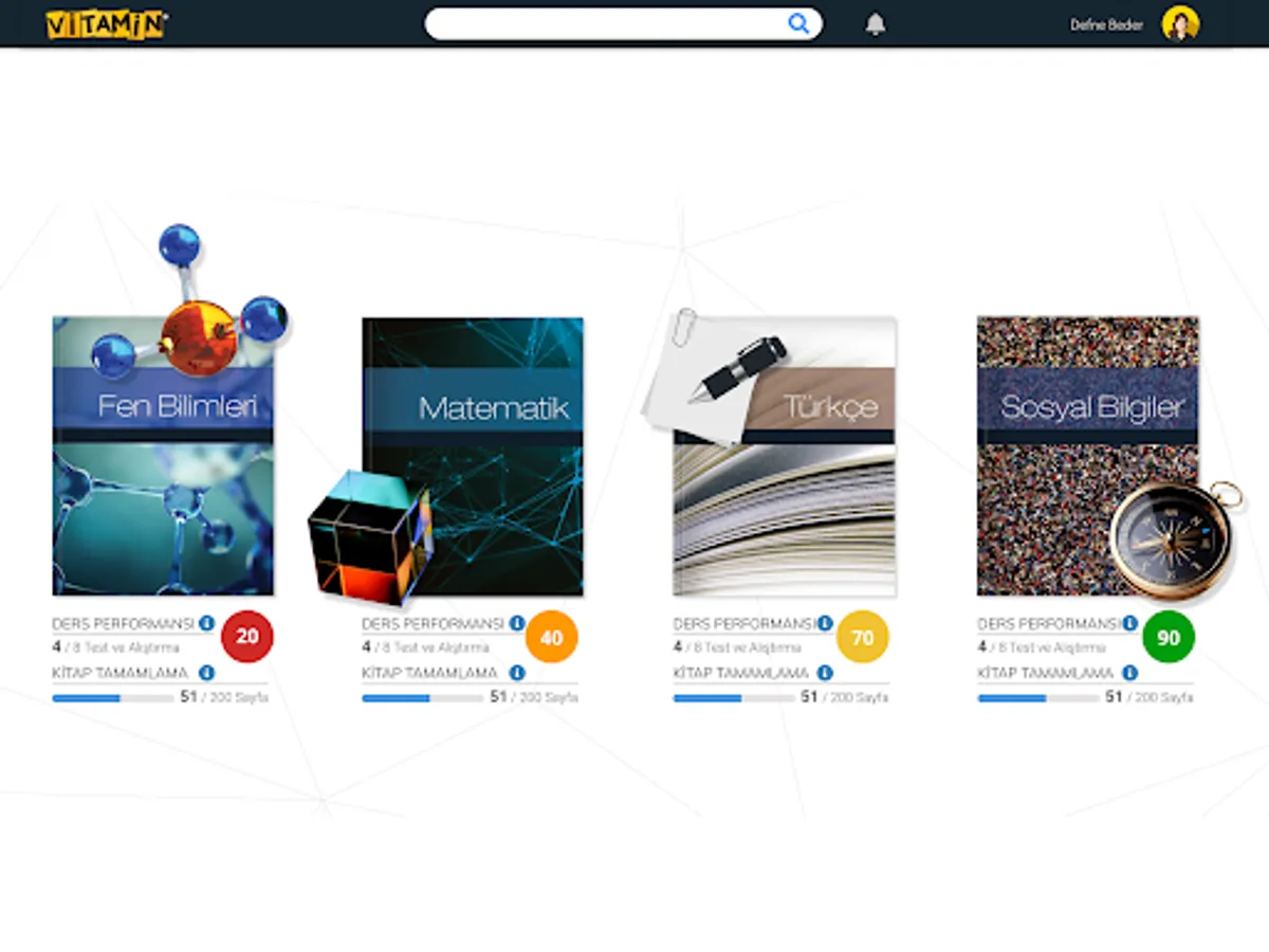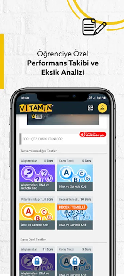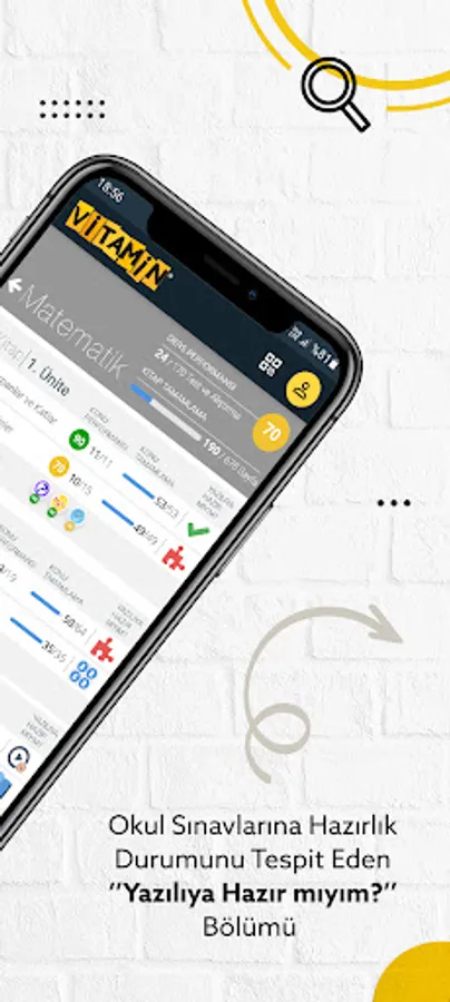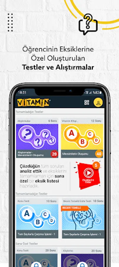 All content, which is structured in accordance with the psychological-cognitive learning levels of age groups, supports the student's learning by discovery and reaching permanent information. With the Vitamin Mobile Application, the student can access all digital content on their mobile phone, solve the screening tests and instantly see the answers to the questions, solutions and performance evaluation.