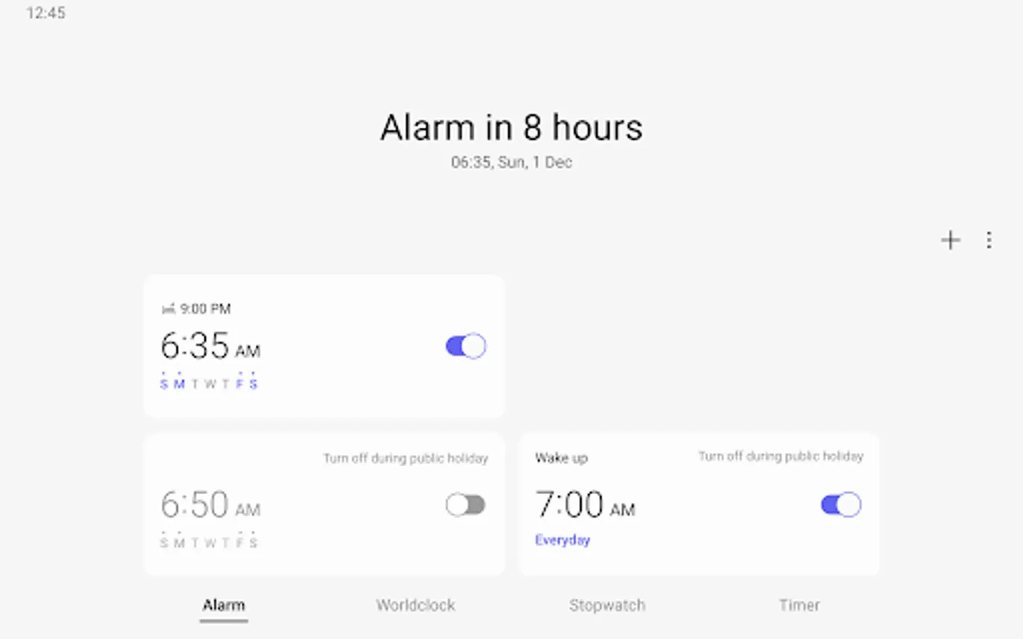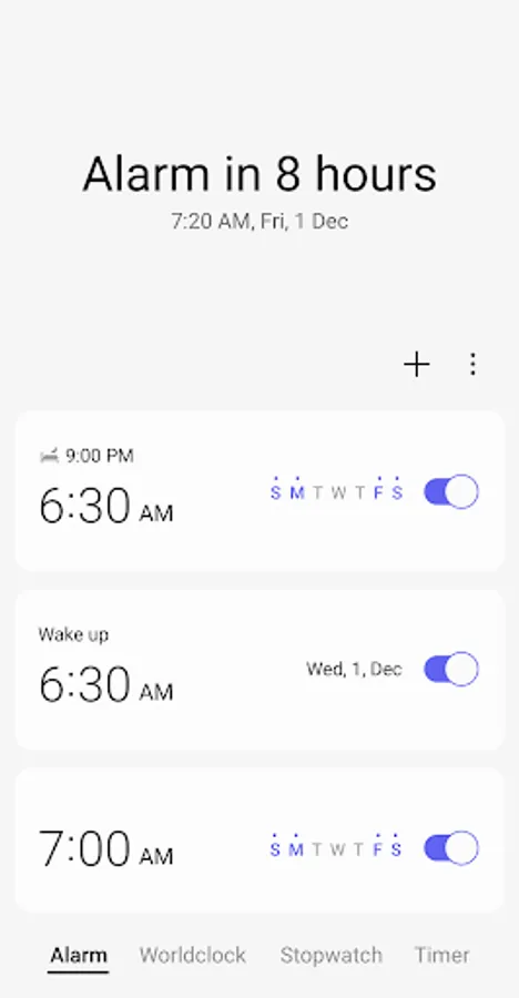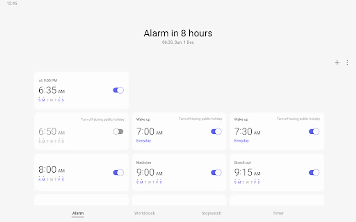 This feature allows you to assign dates to alarms, and repeat alarms can skip one day and be turned on again. The Snooze feature allows you to create the same effect as setting multiple alarms.